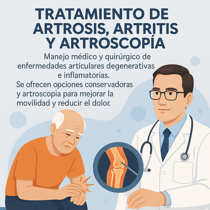 Manejo médico y quirúrgico de enfermedades articulares degenerativas e inflamatorias. Se ofrecen opciones conservadoras y artroscopía para mejorar la movilidad y reducir el dolor.